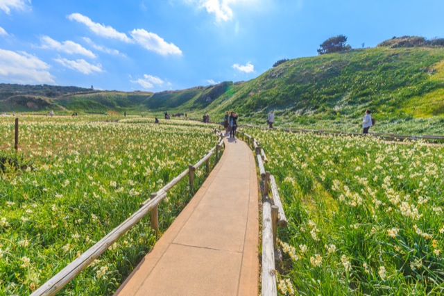 最盛期となる1月には 約300万本の水仙 が甘い香りを漂わせ、青い海とのコントラストがとても美しいスポットです。